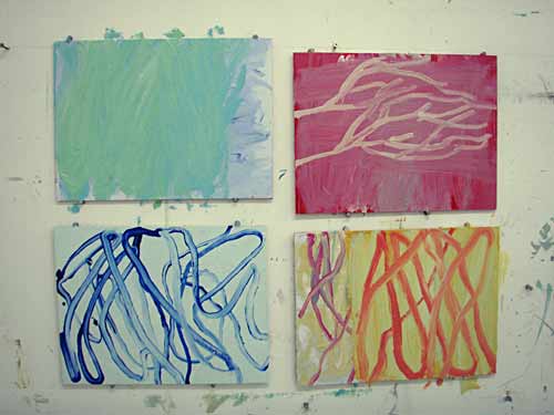 The oil paintings are similarly developed as a response to natural forms yet are further abstracted, retaining mere vestiges of images. Rather, the forms are articulated by brushmarks, gestures and the surface manipulation of oil paint. They are as much about the painting materials, colour and physical qualities of paint as the natural forms that inspired them.